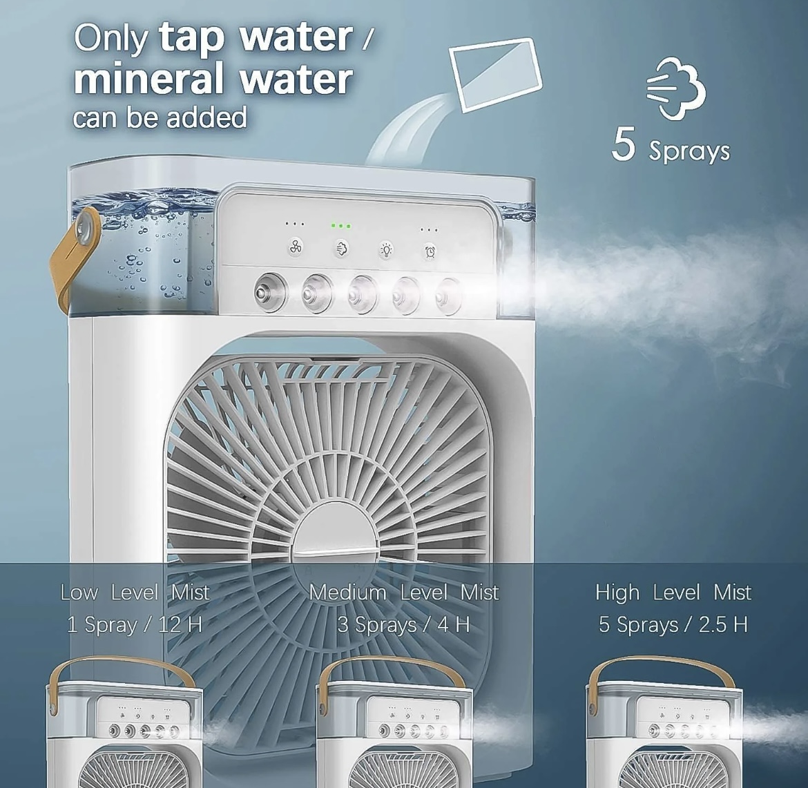 The device shown in the image is a portable mini evaporative air cooler, often sold under the brand name Drumstone or similar generic names. This compact unit is designed for personal use in small spaces like desks or bedrooms, functioning as a 3-in-1 device that combines a fan, a humidifier, and a cooling mist sprayer.